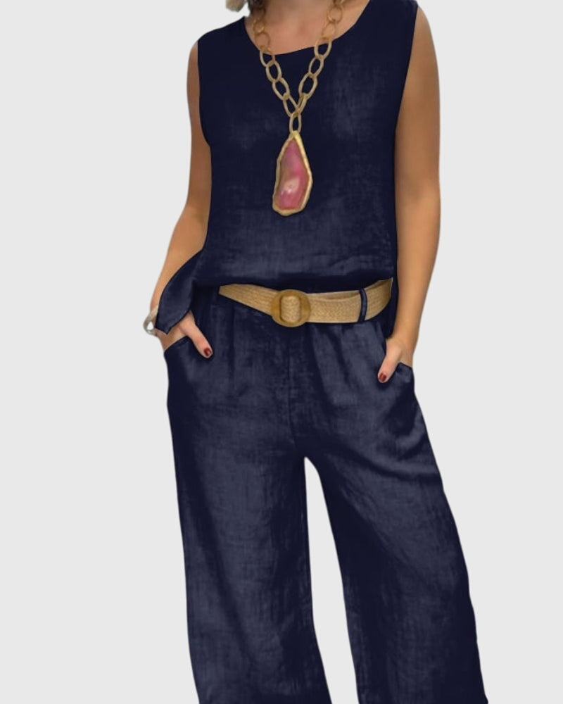 - Bezproblemowa Elegancja: Ten zestaw dwuczęściowy łączy bezrękawnik z szerokimi spodniami, tworząc bezproblemowy, elegancki wygląd.
